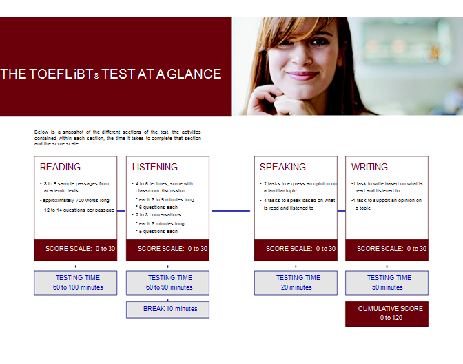 The TOEFL iBT® test measures the ability to use and understand the English language as it is read, heard, spoken, and written in the university classroom. The TOEFL test is the world’s most trusted and widely accepted English-language assessment. It has helped millions of people achieve their dreams to study, work or live abroad. More than 10,000 institutions of higher education, government agencies and organizations worldwide accept TOEFL scores for making important decisions. More than 30 million people from all over the world have taken the TOEFL test to demonstrate their English-language proficiency. Each TOEFL iBT® test contains four sections: Reading, Listening, Speaking, and Writing. The questions in these sections measure how well you read, listen, speak, and write in English.